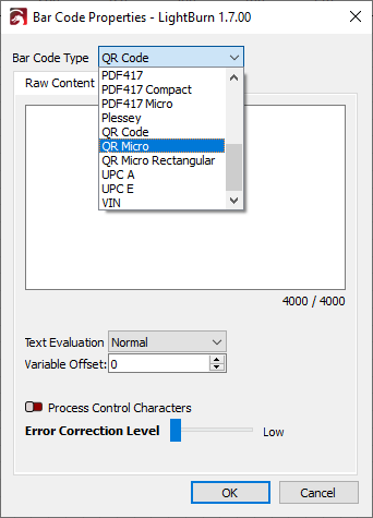 Normal is selected by default — the data stored in your Bar Code will match the Raw Content exactly, if you leave Normal selected.