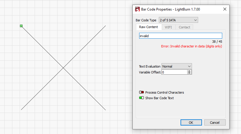 If the data you've entered is invalid for the type of Bar Code you've selected, you'll see an X in the Workspace and an error message in the Bar Code Properties window.