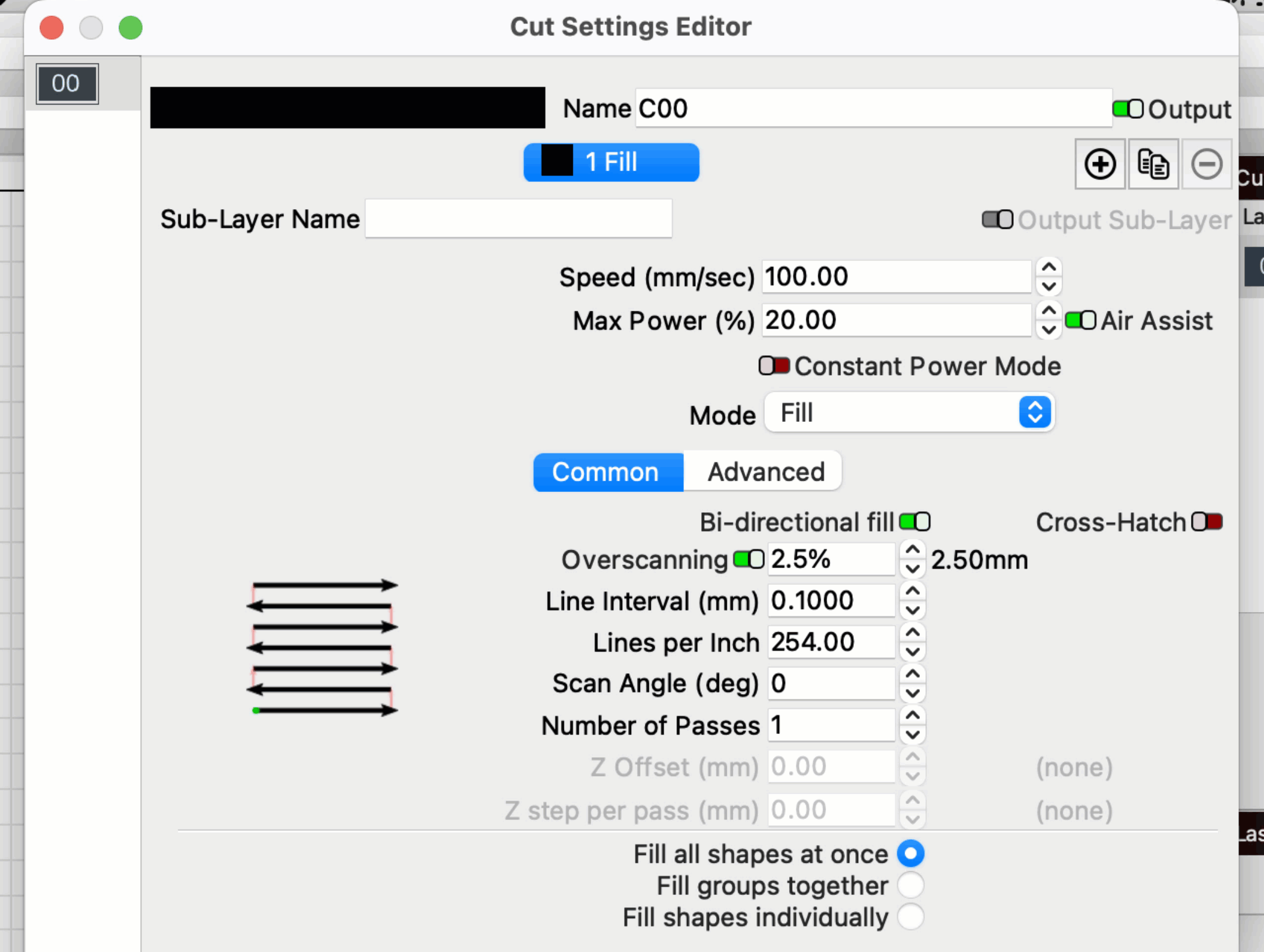 Fill layers are always set to Bi-directional fill and Fill all shapes at once. Scan Angle is set to 0°.