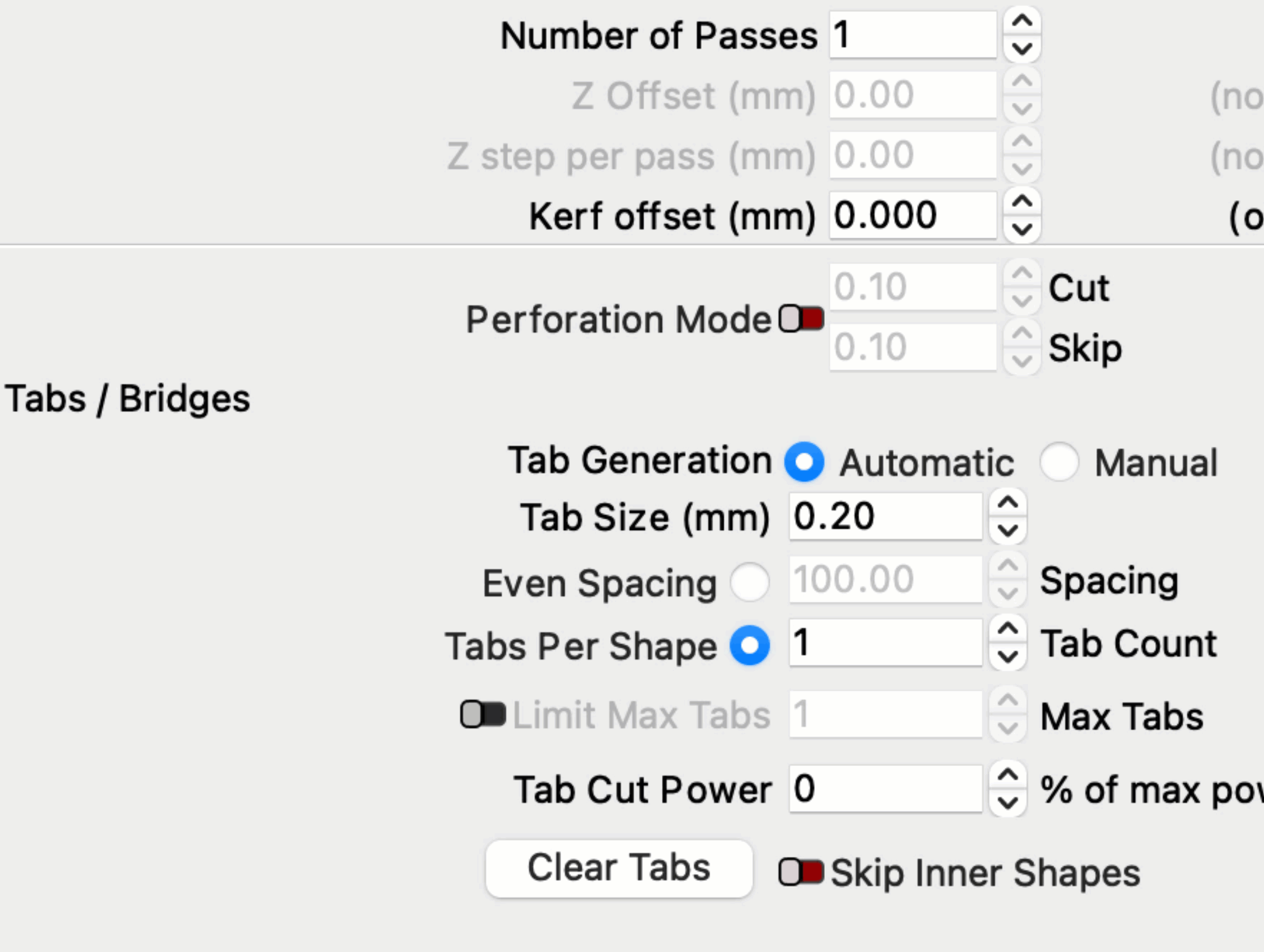 The Tabs / Bridges section of the Cut Settings Editor for Line layers is hidden.