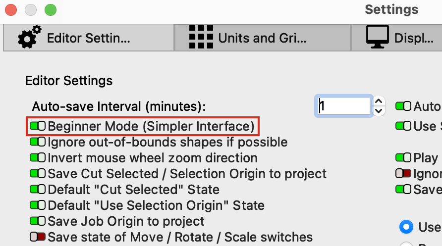 Beginner Mode simplifies the LightBurn interface by removing several options that new users are unlikely to use.