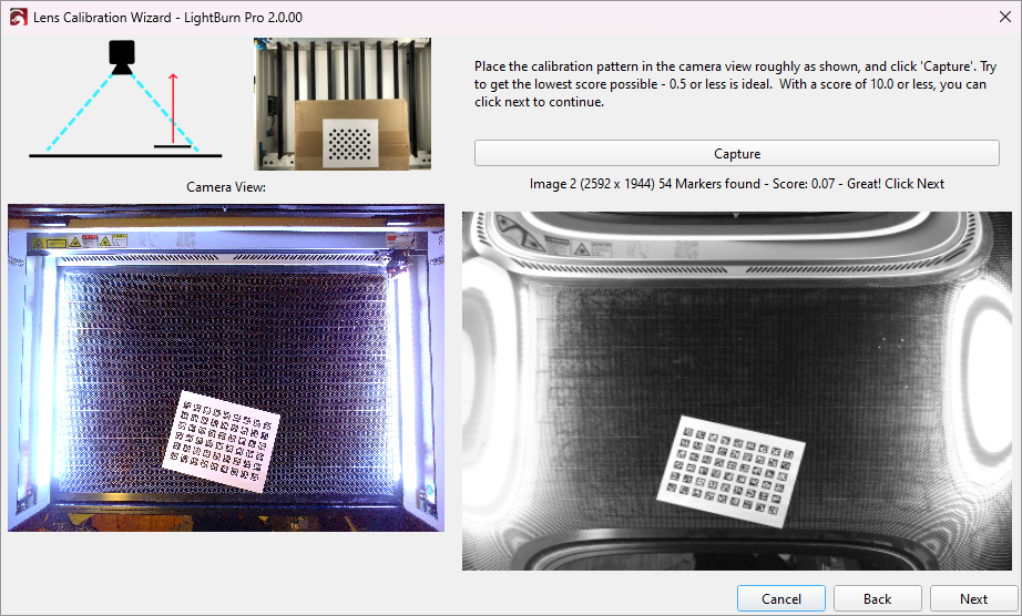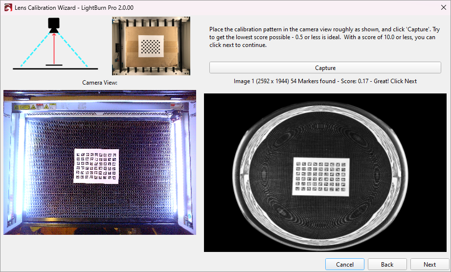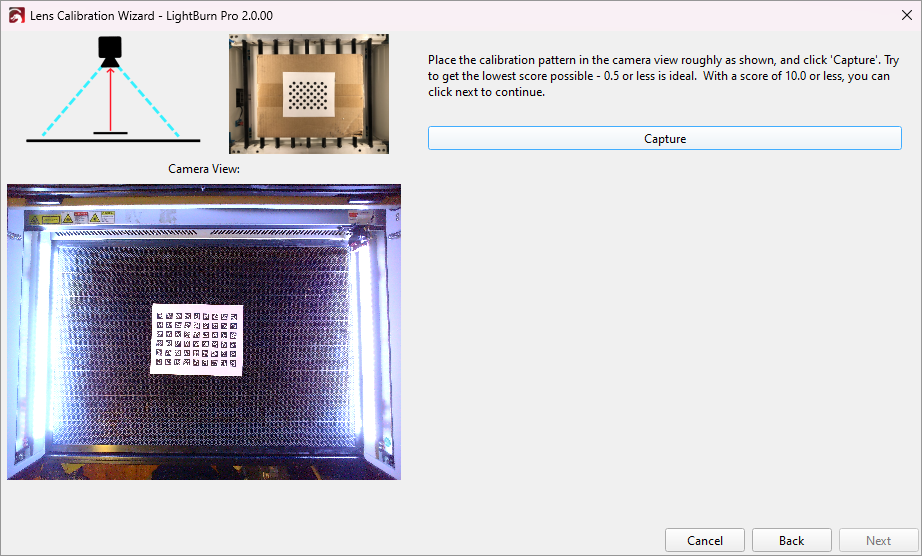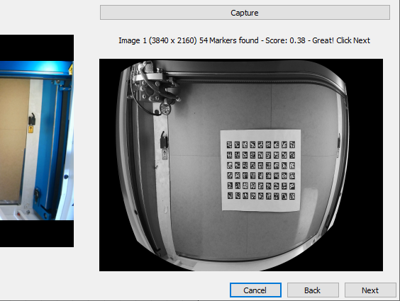 The view will change to include a Capture button, and a diagram to show you how to position the printed pattern. For the first capture, place the pattern in the center of the field of view of the camera, with the printed face of the card pointed directly at the camera, as shown in the small view up top. If you cannot easily match your capture image with the suggested image, you may need to adjust the scale of your printed card, or take the camera out of the machine for lens calibration.