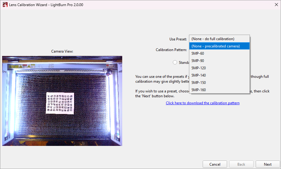 Some lasers come with pre-calibrated cameras. If your camera doesn't require calibration, you can select the None - precalibrated camera option in the Preset dropdown.