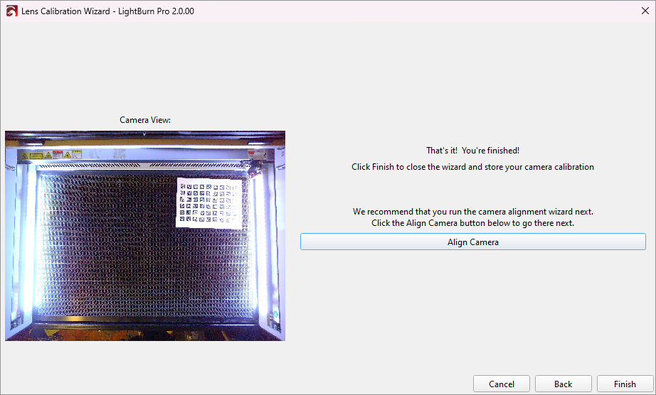 When you have advanced through all the steps, and you are satisfied that you have a good calibration result with a nicely undistorted image, click Finish to save the results. You can also click the Align Camera button on the final page to move immediately on to the Camera Alignment Wizard.