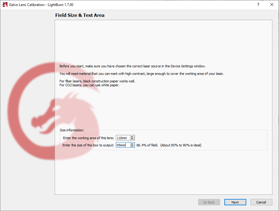 Enter the working area of your lens (this value is usually provided by the manufacturer) as well as the size of the box to output — a value between 85% and 90% of the working area is ideal.
