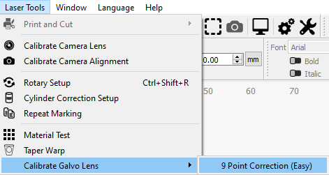 To open the Galvo Lens Calibration wizard, go to Laser Tools → Calibrate Galvo Lens → 9 Point Correction (Easy).