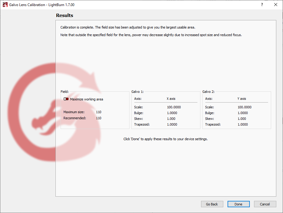 Toggle on Maximize working area to increase your laser's Field to the maximum size possible, if a larger possible size is indicated by the measurements you entered. Note that you may see a reduction in power output in areas outside the dimensions specified by the lens' manufacturer.