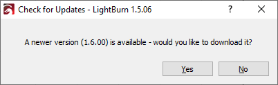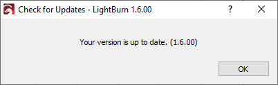 Go to Help → Check for Updates to tell LightBurn to check for available updates. There are three possible responses.