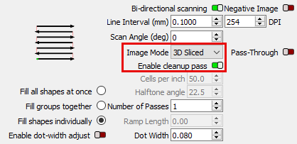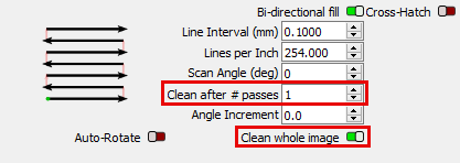 Cleanup passes are typically run with a tighter Line Interval, higher Frequency, and lower Max Power than the main engraving passes, and are used to clear debris and produce a better finish.