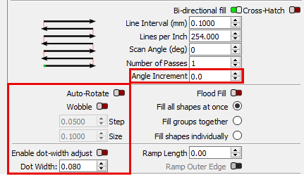 The Angle Increment setting applies to passes within a single job. Each time the job is run, the Scan Angle returns to its starting value. To change the Scan Angle each time the job is run, see Auto-Rotate.