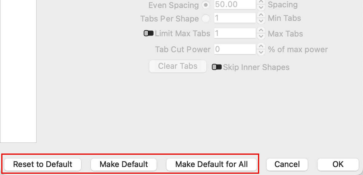 Reset to Default: reset the layer to the default settings. Hold Shift while clicking Reset to Default to reset to LightBurn's universal defaults.