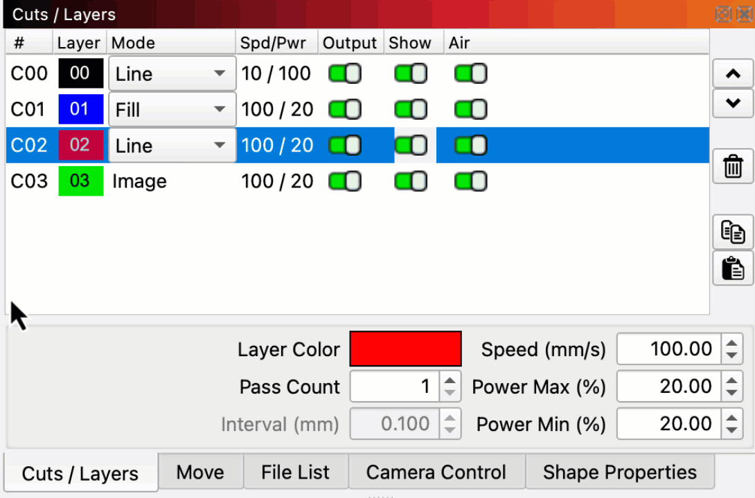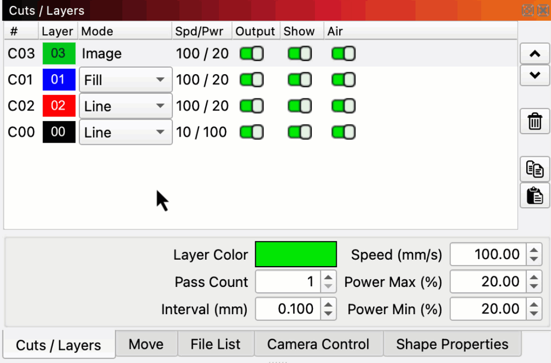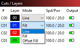 The Cuts / Layers Window shows the list of layers in your project. From the Cuts / Layers Window, you can assign different operations to specific layers, control the order the laser processes the layers, adjust an abbreviated set of settings for each layer, and more.