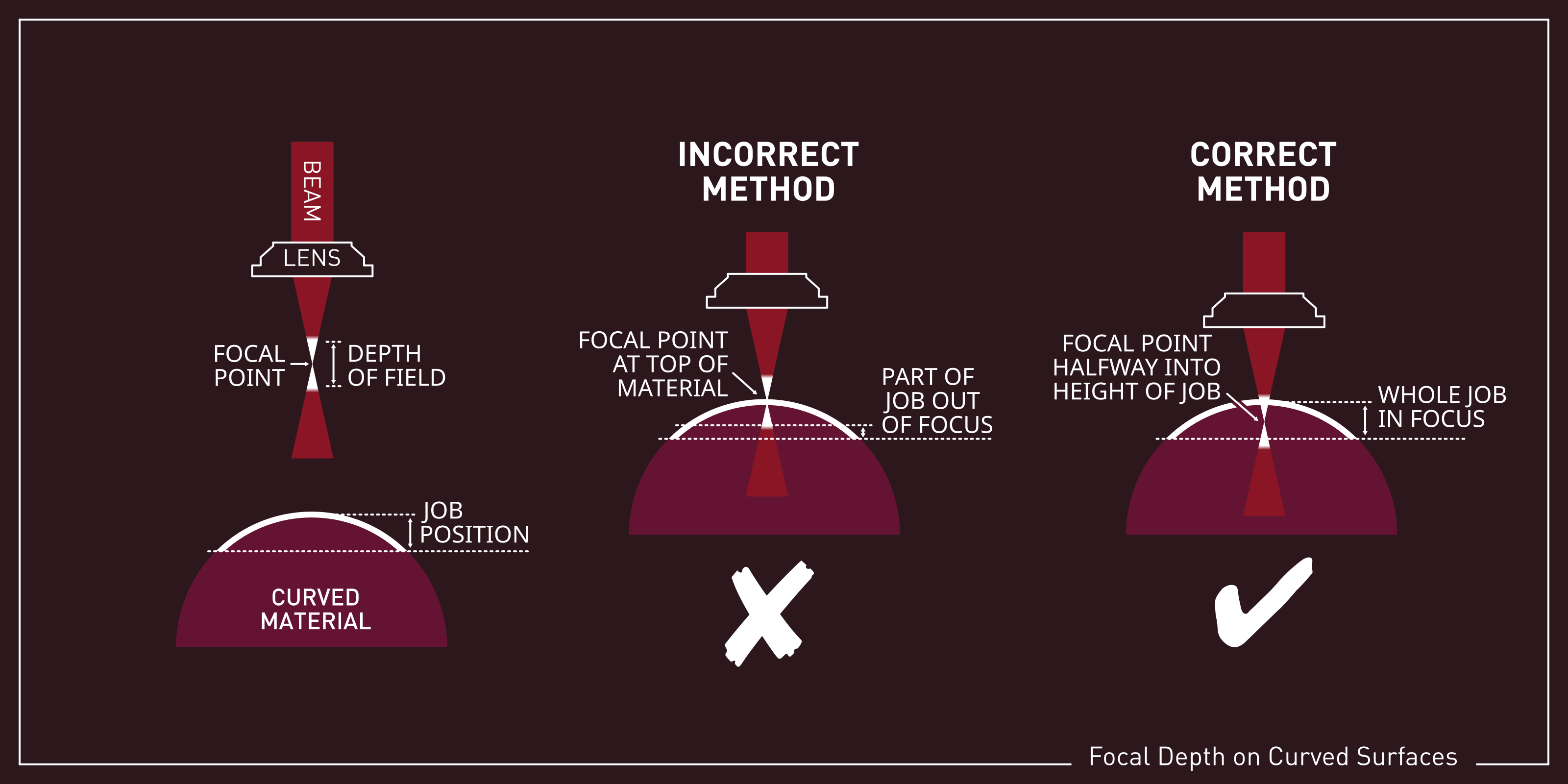 When using Cylinder Correction, you'll be marking across a larger range of focal distances than is typical when marking flat surfaces. For instance, if you have a 75 mm diameter tumbler and are engraving a 50 mm wide graphic, there will be about 10 mm difference in focal distance across your design.