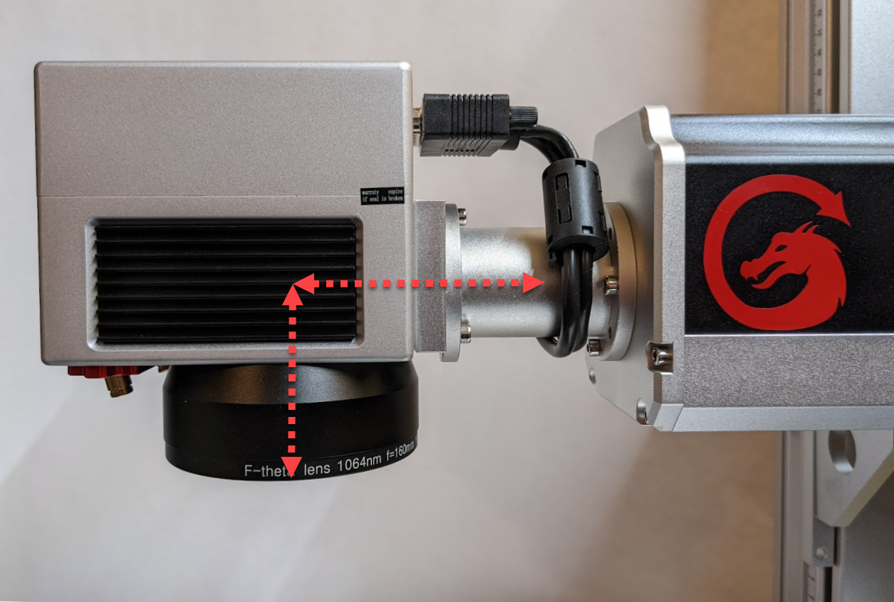 To use Cylinder Correction, you'll need to identify where your mirrors are. The mirrors are typically centered along a tube connecting the galvo head to the laser source. In the image below, a horizontal line marks the center of this tube.