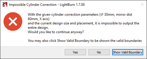 If you try to Preview or run a cylinder-corrected engraving while a portion of your design is outside of the valid area, LightBurn will pop up a warning asking you whether you'd like to continue anyway, show the valid boundary, or cancel. If you engrave anyway, LightBurn will automatically cut off the portions of the design outside the valid boundary area, as shown below.