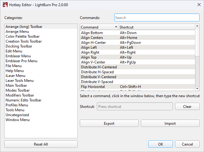 From this window, you can also use Reset All to return hotkeys to their defaults, or use the Export and Import buttons to back up your custom hotkeys or restore a backup. Custom hotkeys can also be imported and exported as part of a User Bundle.