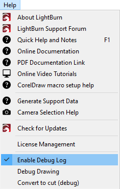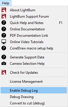 Go to Help → Enable Debug Log to begin recording a log of the actions you take in LightBurn. A check mark will appear next to it when it's enabled, and logging will continue until you select Enable Debug Log again to disable it, or restart LightBurn.