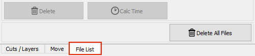 Press the Calc Time button to begin computing the job completion time for the selected file. The Calc Time button is available only on supported DSP controllers (Ruida). This can take a considerable amount of time for engraving jobs, as the controller is simulating the job through the onboard DSP microprocessor. Once complete, the calculated completion time will be shown in the Info column.
