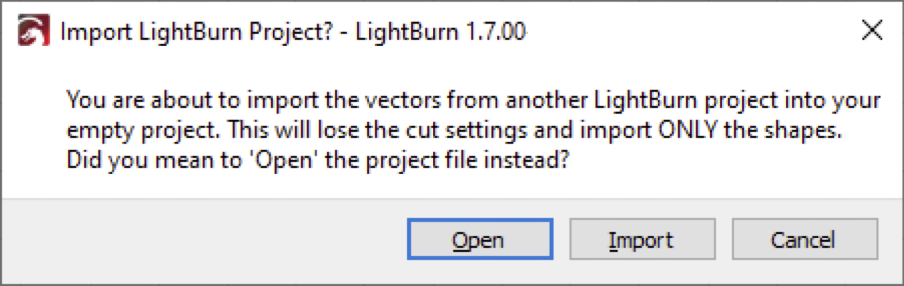 LightBurn will warn you if you attempt to Import a .lbrn or .lbrn2 file.