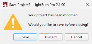 If you have an existing project open with unsaved changes, LightBurn will ask you if you'd like to Save before Opening the project, click No to discard the changes, or Cancel to abort the process.