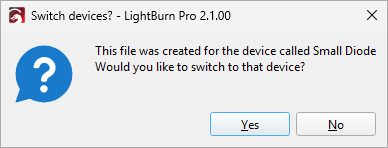 If you have multiple device profiles, and the device you were using when you Saved the file is not currently selected, LightBurn will ask if you'd like to automatically switch to that device profile.