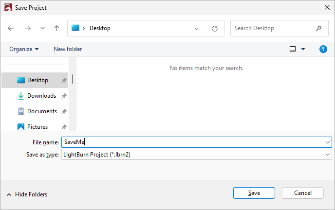 Unless you need to maintain compatibility with extremely old versions of LightBurn or need an easily human-readable file, we recommend leaving the file type set to .lbrn2.