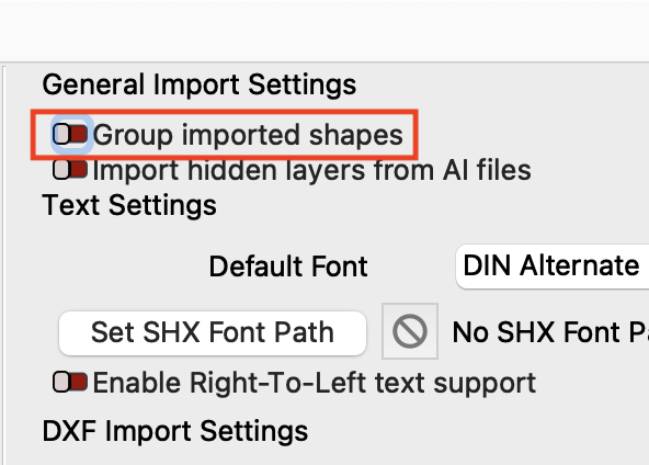 Imported shapes are Grouped by default. Disable Group imported shapes in your Settings to turn off automatic Grouping upon importation.