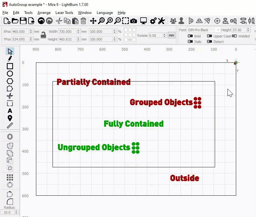 In the animation above, the objects shown in red are unaffected by Auto-Group, either because they're not fully contained within the rectangle or because they are already Grouped. The green objects are automatically Grouped with the rectangle.