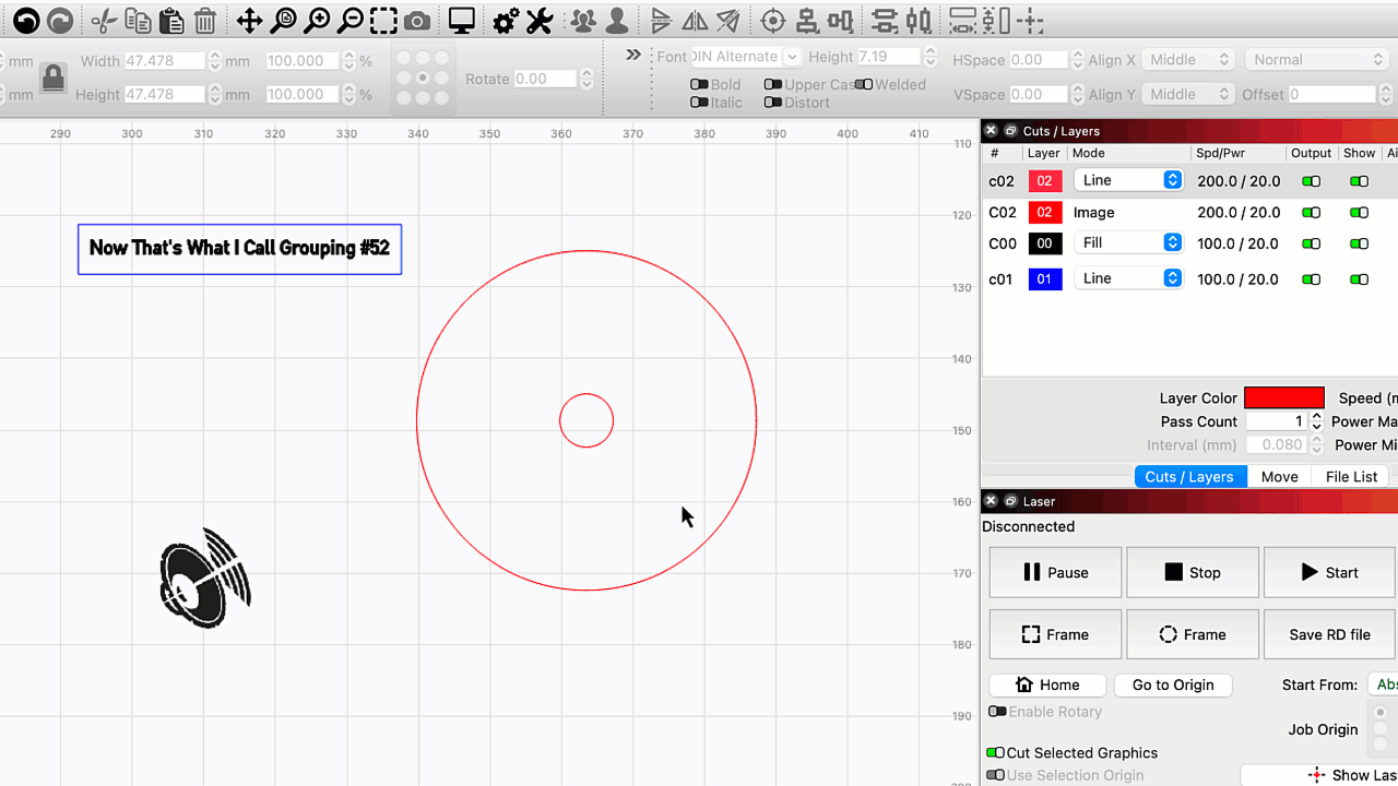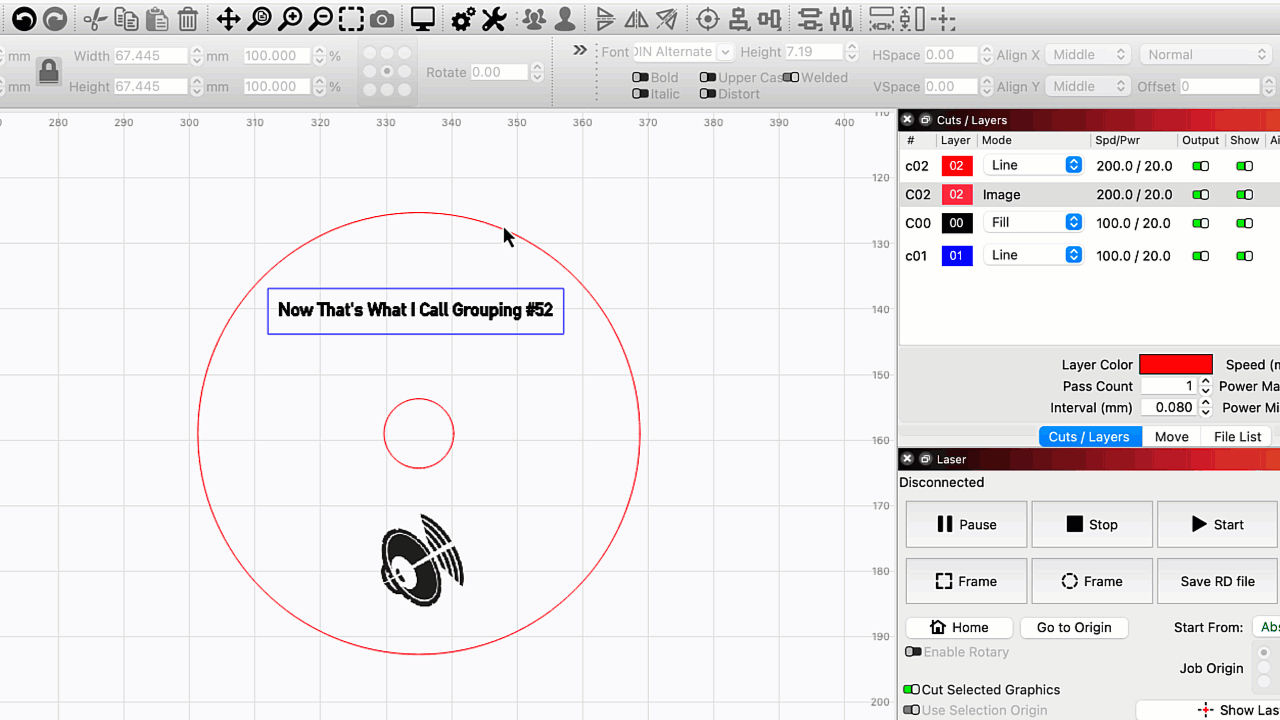 LightBurn also provides options in Optimization Settings to tell your laser to engrave Grouped objects together or to cut and engrave multi-layer Groups in order, completing each layer in each Group before moving on to the next one.