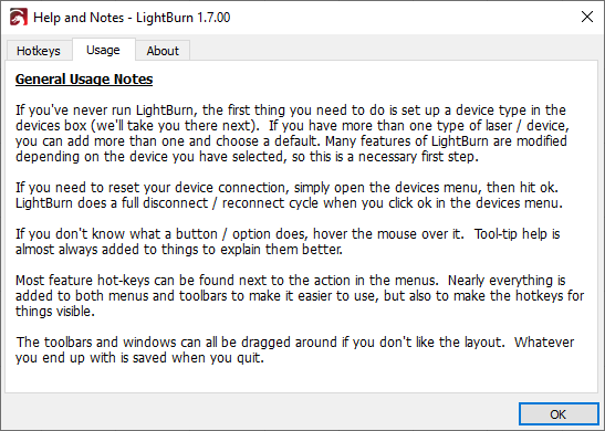 • About contains information about the version of LightBurn installed on your computer.
