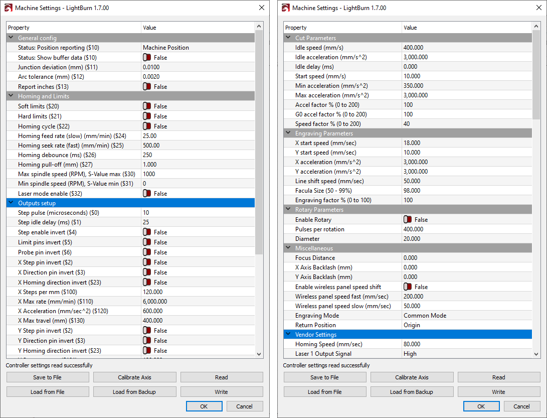 The settings available are determined by your laser controller's firmware. In general, if your laser is working correctly, you can (and should) leave the settings here alone. For additional information on specific settings, consult your laser's manufacturer, or see the documentation for your laser's controller.