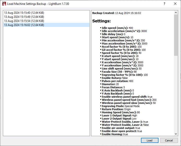 Use Load from Backup to restore automatically-generated backups of firmware settings. LightBurn will automatically store backups each time you Write new settings to your controller.
