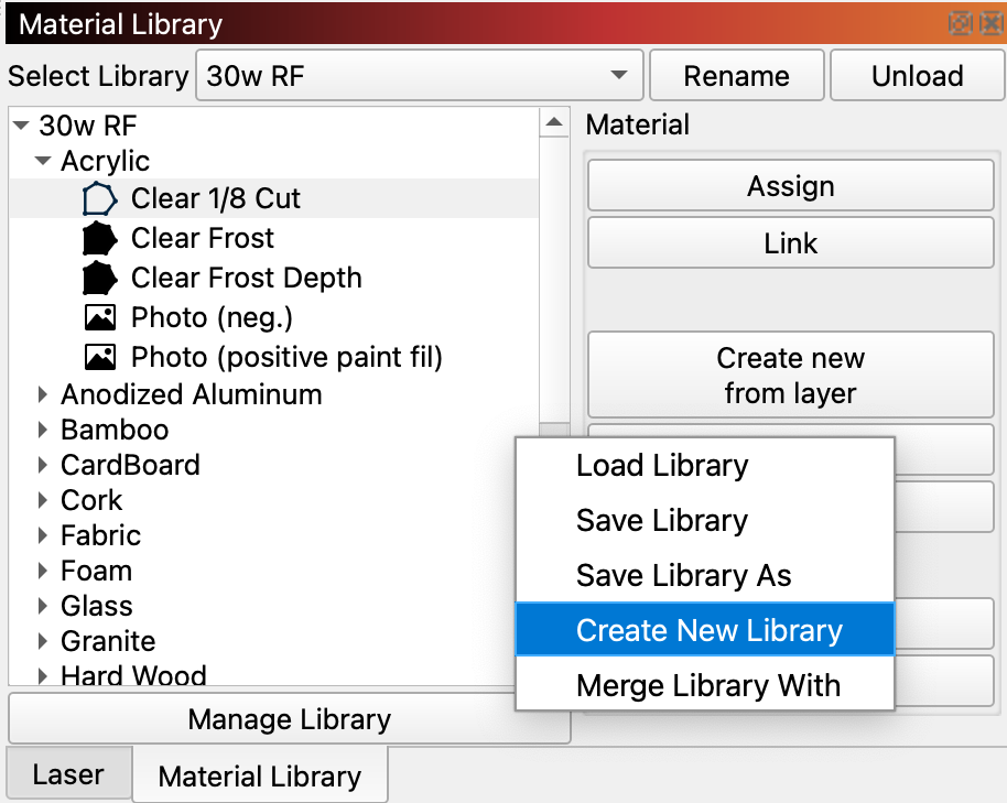 If you have multiple lasers, it's typically best to create a Material Library for each laser.