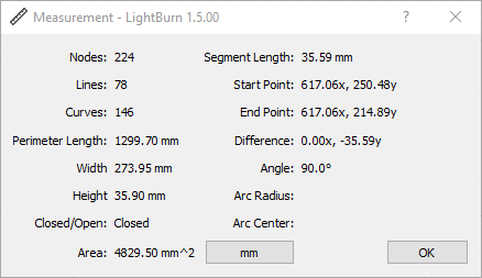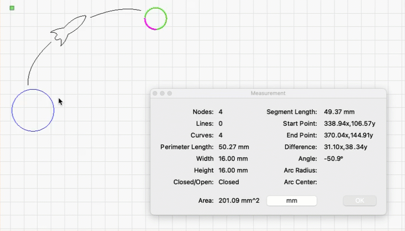 Use the Measure tool to hover over any shape in your Workspace and display an array of useful information about it, including perimeter, overall dimensions, whether it is Open or Closed, and the lengths of individual line or curve segements within it. You can also click and drag to create and measure a temporary line between two points.
