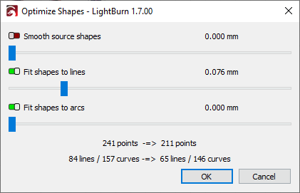 At the bottom of the window, LightBurn displays the number of Points (nodes), Lines, and Curves (arcs) in the original shapes and in the optimized versions of the shapes.