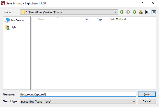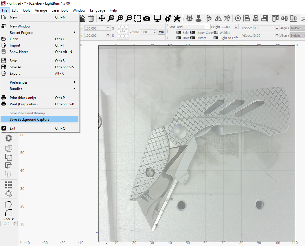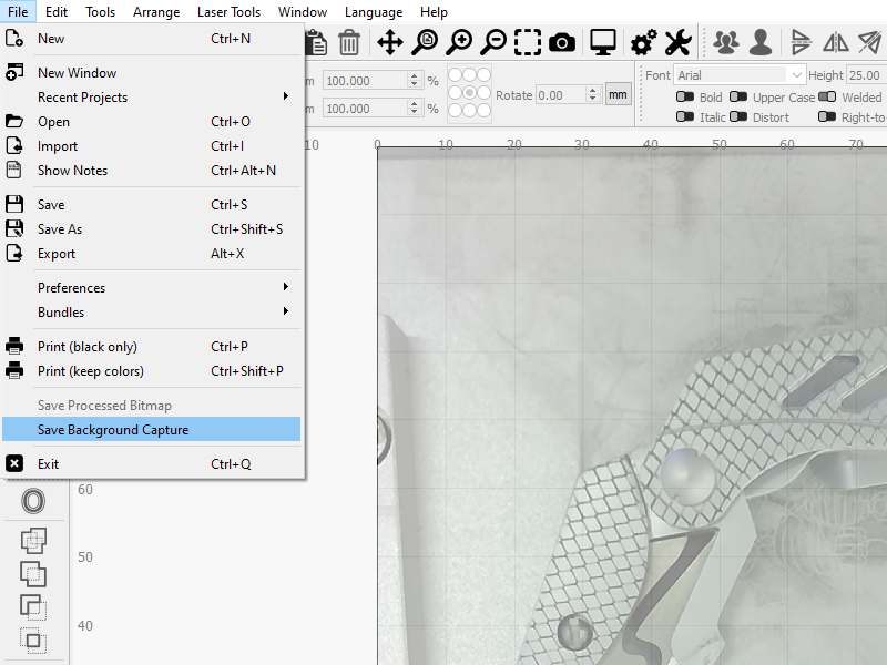 Use Save Background Capture to save a bitmap image of an Overlay produced by a camera affixed over your laser's work area.