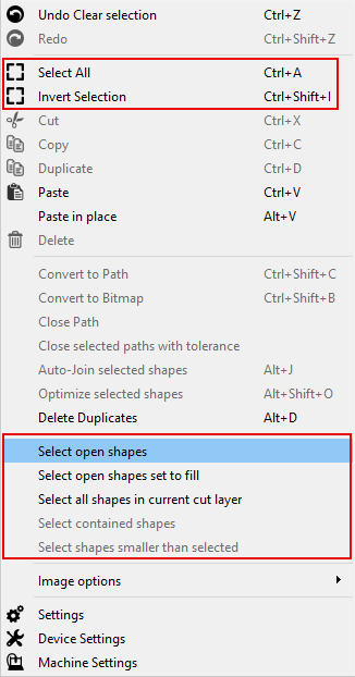 Selects all shapes in your project that are open, and assigned to a layer set to Fill or Offset Fill Mode. LightBurn is unable to fill open shapes — this tool is a useful option for identifying them.