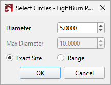 Selects all circles of a specific size or within a size range. Select Exact Size and specify a size, or select Range and choose a minimum and maximum size.