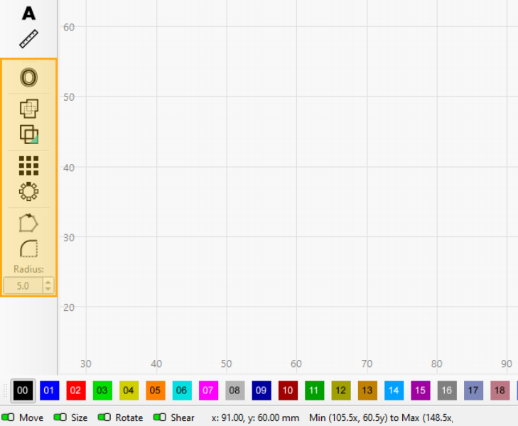 The Modifiers Toolbar is normally vertical, but can also be removed from the left-side toolbar and oriented horizontally, as presented below. See Customizing the LightBurn Window for more information.