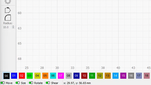 View the live and precise X and Y Axis coordinates of the mouse cursor within and around the LightBurn Workspace on the left side of the Status Bar. The displayed coordinates will stop updating when the mouse cursor leaves the area around the Workspace — for example when choosing tools, working within windows and toolbars, or interacting with menus.