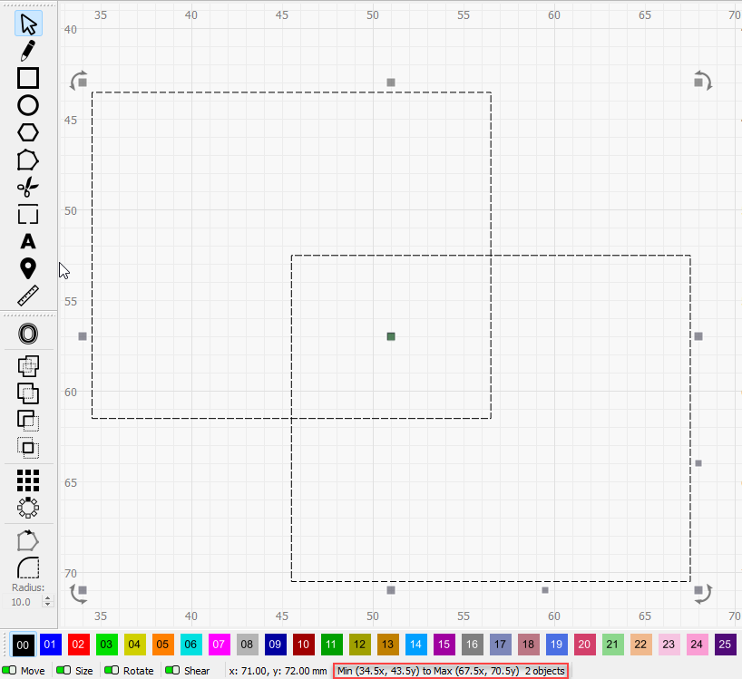 Meaning: The rectangular selection bounding box has the corner closest to the origin at (34.5, 43.5) and the corner the farthest away from the origin at (67.5, 70.5), with two objects included and selected.