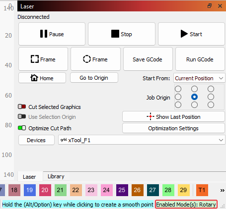 The Status Bar is located in the bottom left-hand portion of the LightBurn window directly to the right of the Transform Control Toggles, and shows the precise location of the mouse cursor/pointer; the dimensions and status of items selected; the Notification Area where important tool, program, and laser messages are displayed; and the special Modes indicator.