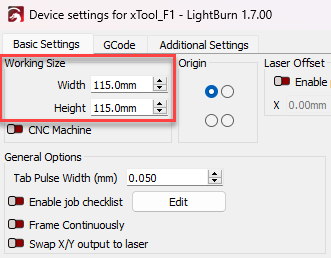 icon in the Main Toolbar or going to Edit → Device Settings → Dimensions / Units → Working Size. Adjust the Working Size Width and Height entries to match the manufacturer-provided values.