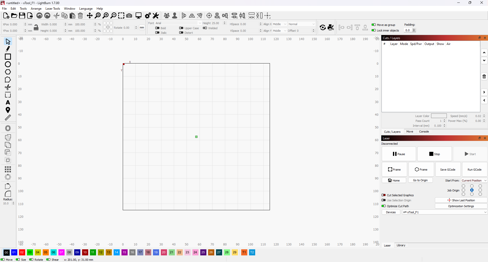 Alternatively, the material being cut or marked can be drawn within the Workspace as a Tool layer with the available LightBurn design Creation tools for similar element alignment and laser framing operations.