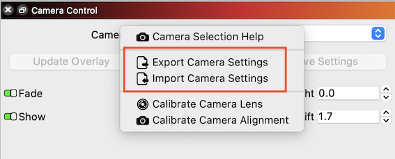 - Right-click in the Camera Control window and select Export Camera Settings to save that alignment information.
