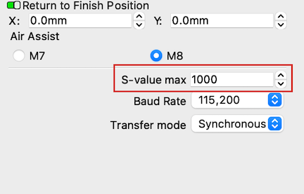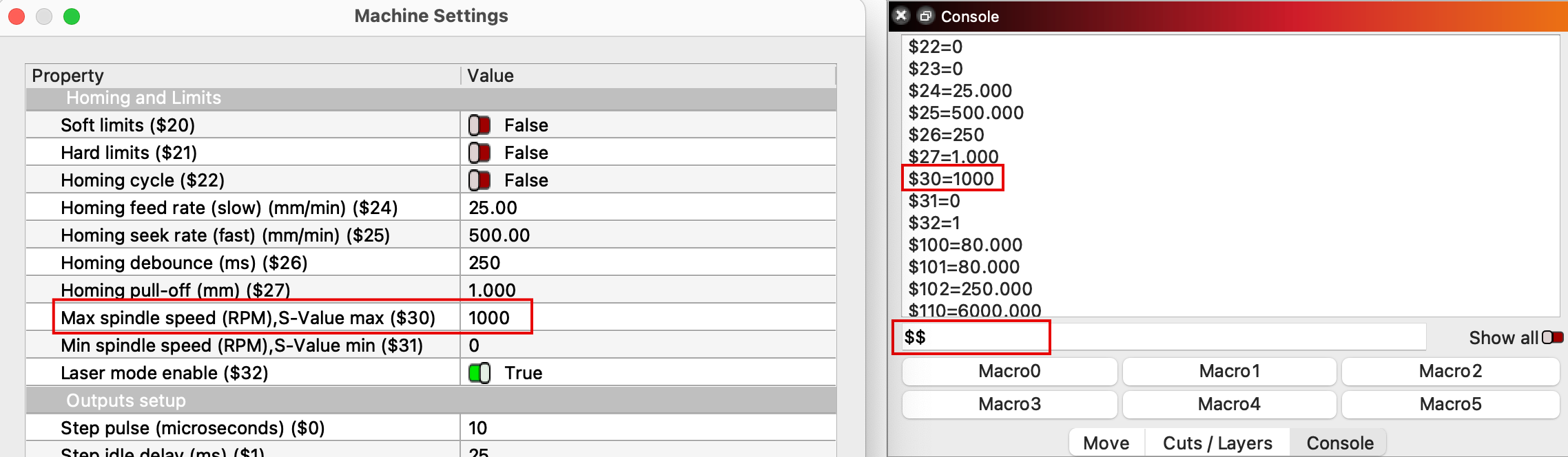 $$in the Console window to see the $30, Max spindle speed setting in your laser's firmware. -