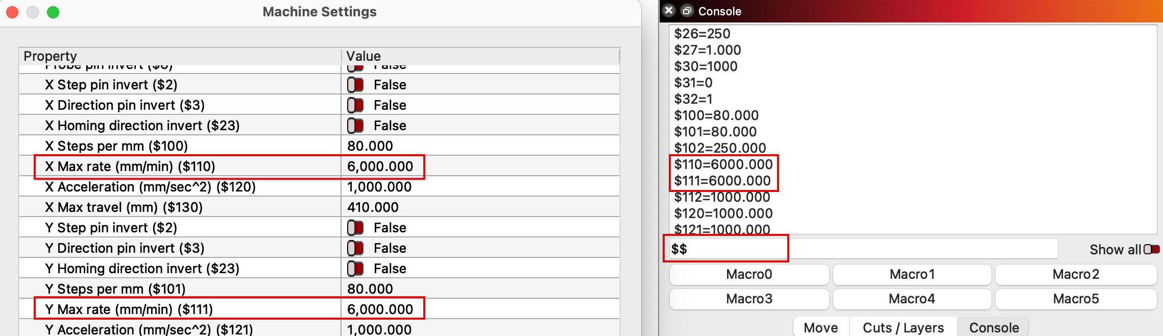$$in the Console window to see the $110/$111, X/Y Max rates set in your machine's firmware. The X and Y Maximum rates are the fastest you can command your machine to travel, in mm/minute. -