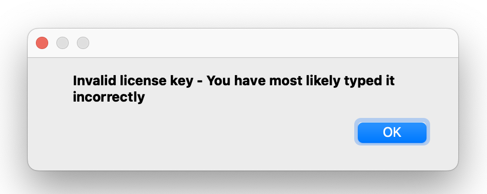 Your license key has been entered into LightBurn incorrectly. To avoid typos when entering your key into LightBurn, we strongly recommend copying and pasting the key directly from your original order email.