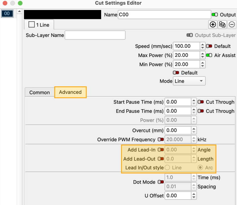 Lead-In / Lead-Out lines are intended to compensate for excessive burning at the starts or ends of cuts by extending the cut line, so the mark is left off of the cut part.
