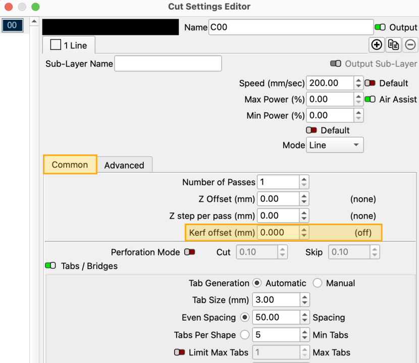 Kerf refers to the thickness or width of a cut made by a cutting tool. Kerf Offset compensates for the extra material removed by offsetting the path of the laser to the outside of closed shapes (for positive values) or the inside (for negative values).